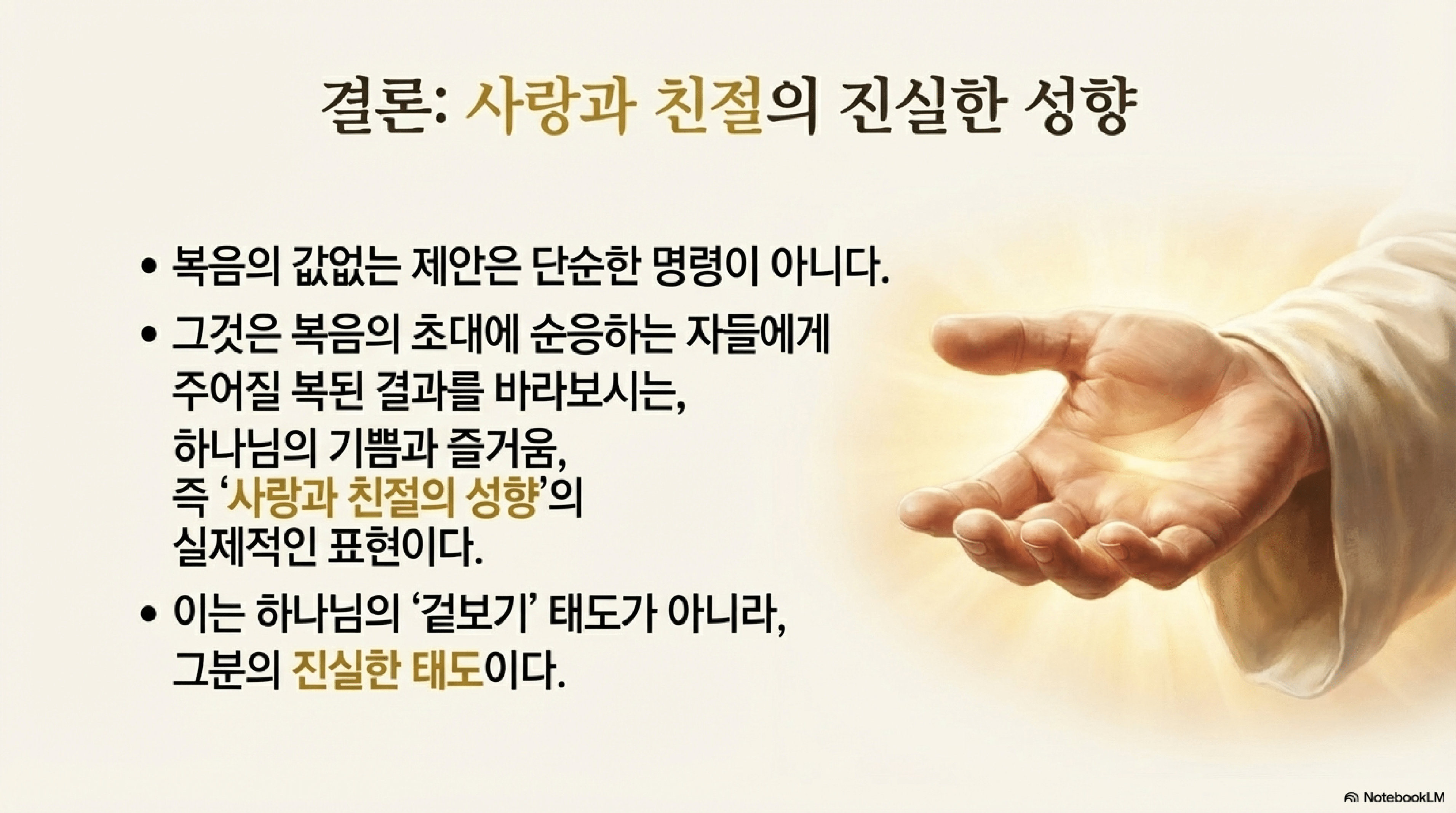 - 자애로운 성품의 표현: 복음 제시 안에는 하나님의 '자애로운 성품'이 표현되어 있으며, 이는 복음의 은혜에 순종함으로써 얻게 될 구원을 향한다.