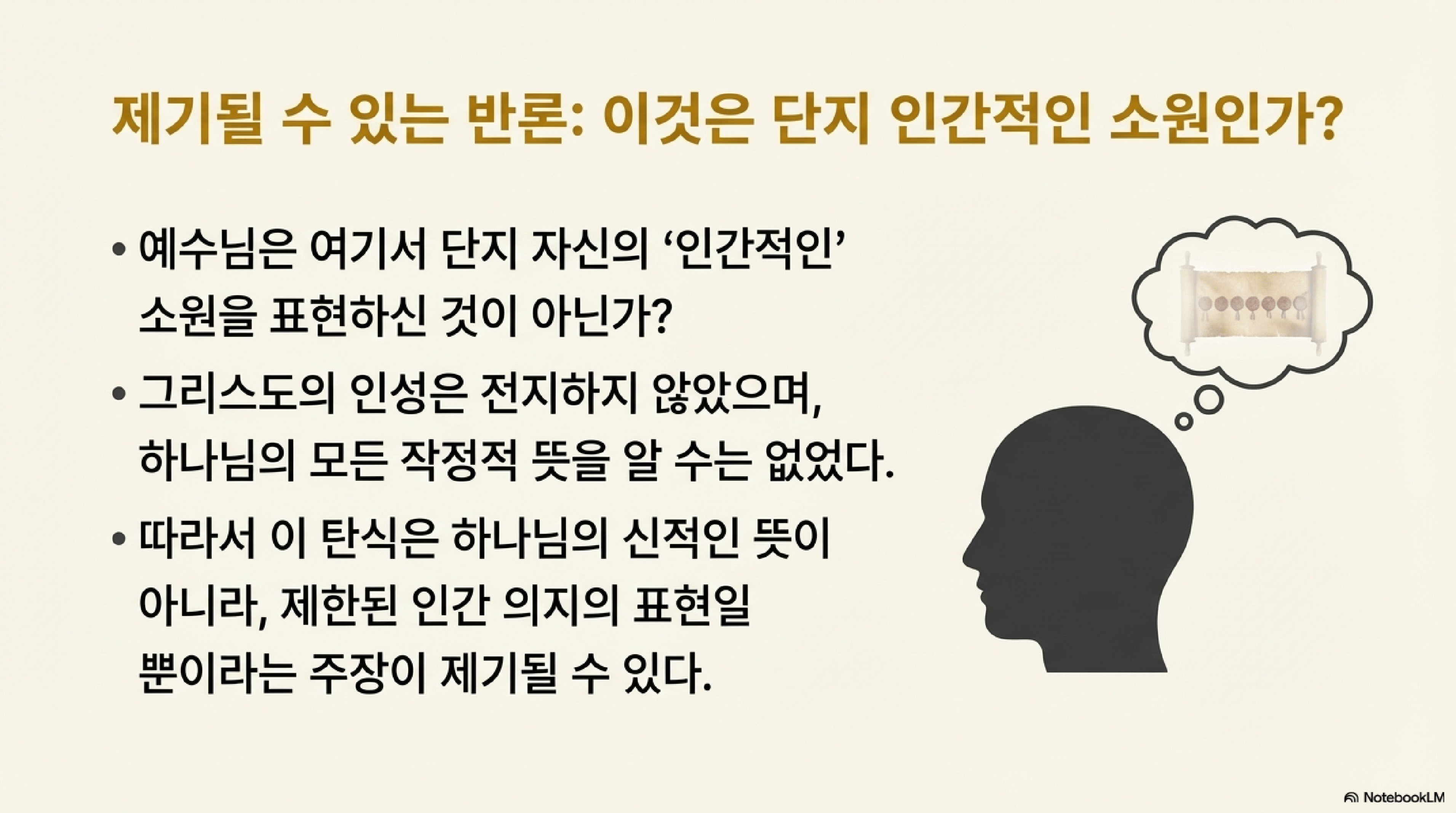일각에서는 이 탄식이 예수님의 전지하지 않은 인간성에 기인한 '인간적 소원'일 뿐이며, 따라서 신적 의지를 반영하지 않는다고 주장할 수 있다. 그러나 존 머리는 다음과 같은 이유로 이 해석이 타당하지 않다고 반박한다.