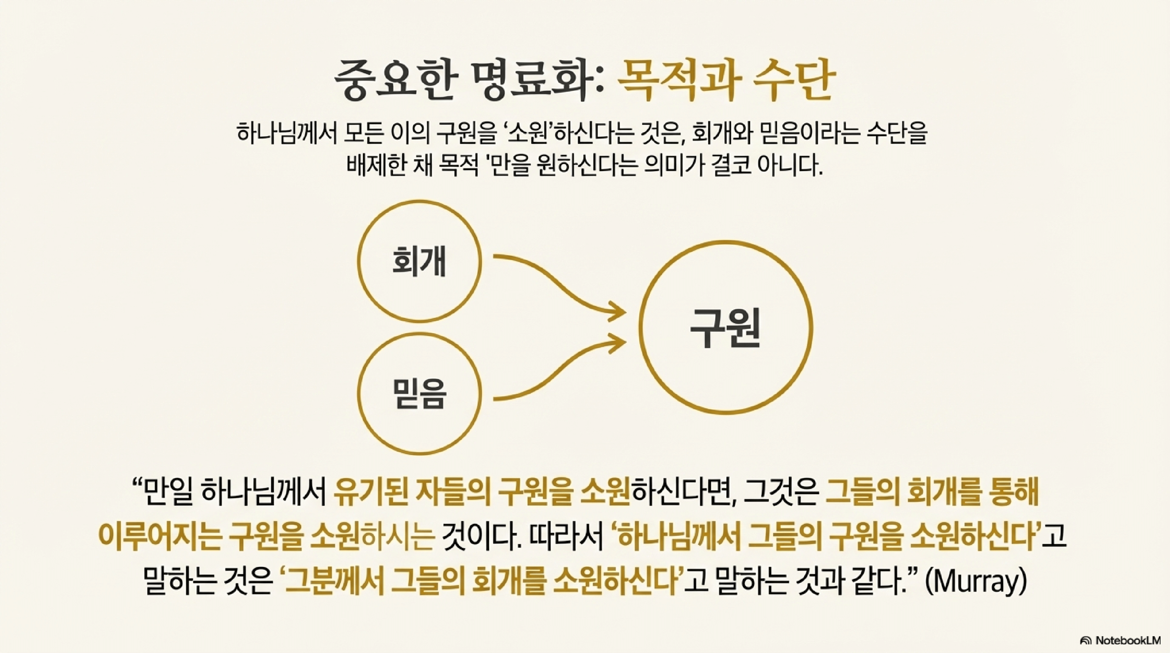 하나님께서 모든 사람의 구원을 소원하신다는 것은 '회개와 믿음이라는 필수적인 수단과 분리된' 구원을 원하신다는 의미가 아니다. 하나님은 그들이 구원의 필수 조건에 순응하기를 바라시는 것이며, 이는 그들의 '회개'를 바라신다는 말과 동일하다. 조건 없는 구원을 소원하시는 것은 선과 악의 차이를 포기하는 것과 같으므로 상상할 수 없다.