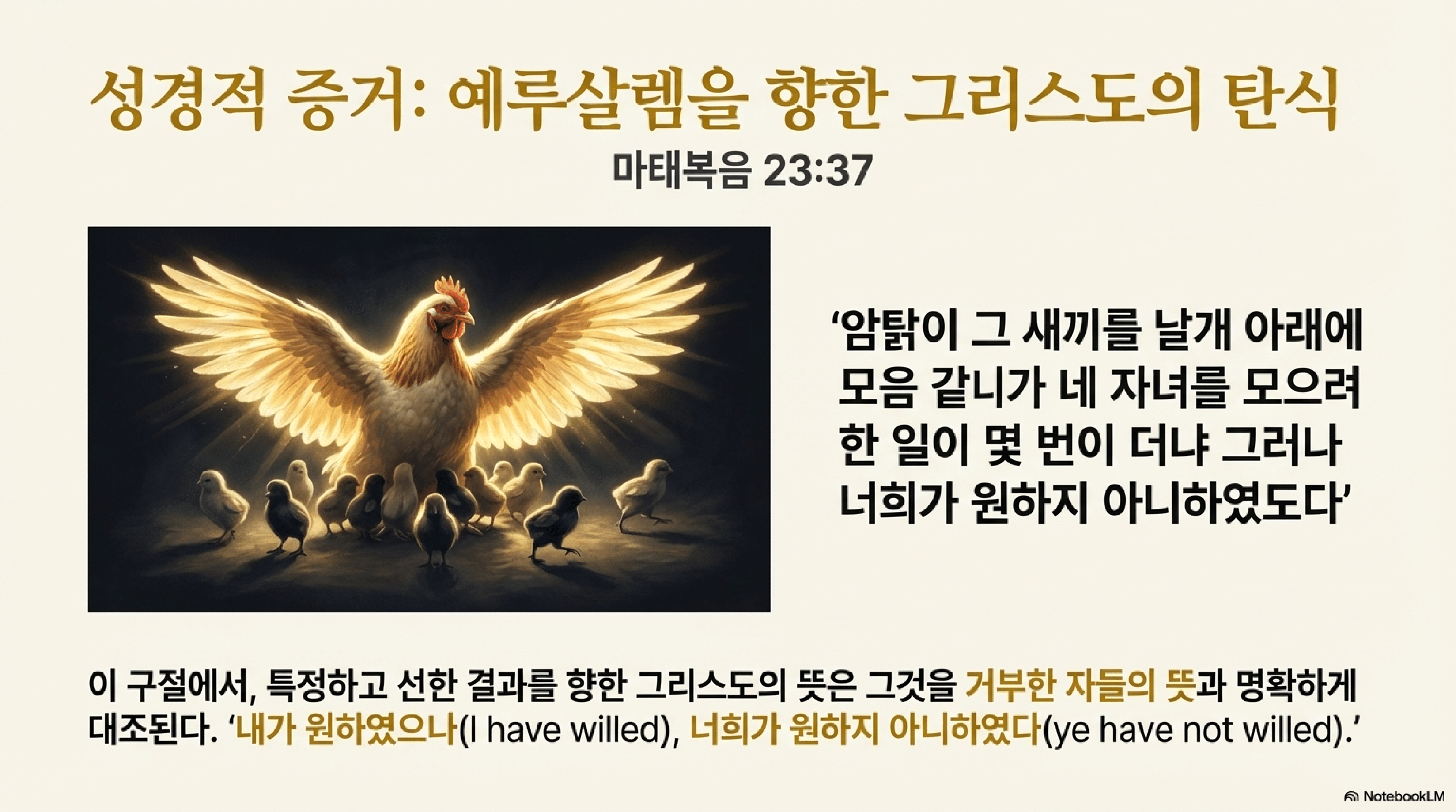 - 예수님의 의지: 예루살렘의 자녀들을 그의 구원과 보호의 은혜 아래 모으기를 '원하셨다(willed/wished)'.