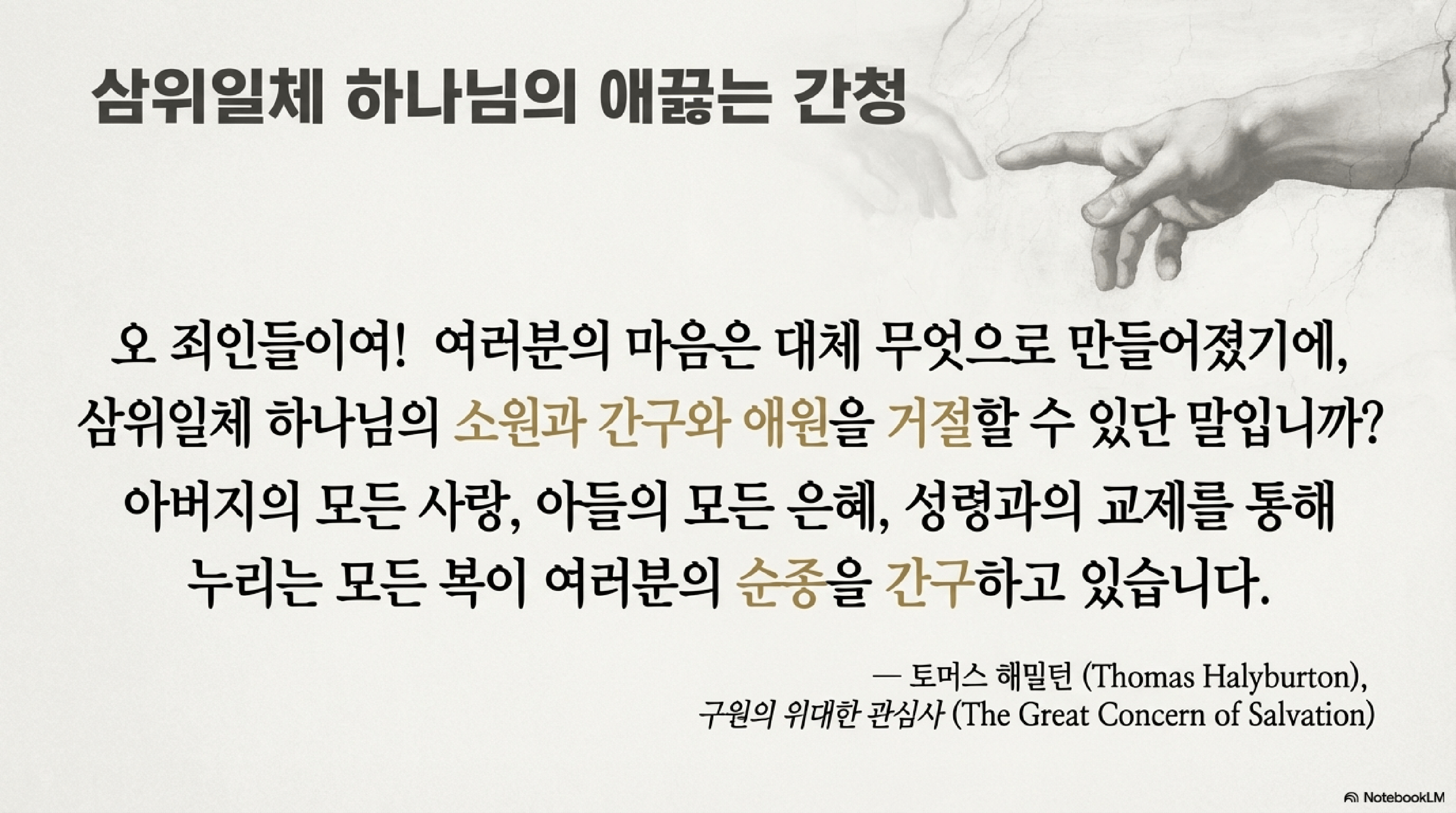 핵심 내용은 다음과 같다.- 삼위일체의 간청: 복음의 권고는 단순히 신적인 명령이 아니라, 성부, 성자, 성령 전체가 죄인들에게 구원을 받아들이라고 간절히 요청하고 애원하는 것이다. 이를 거부하는 것은 삼위일체 하나님의 마음이 담긴 요청을 거절하는 행위이다. (할리버튼)
