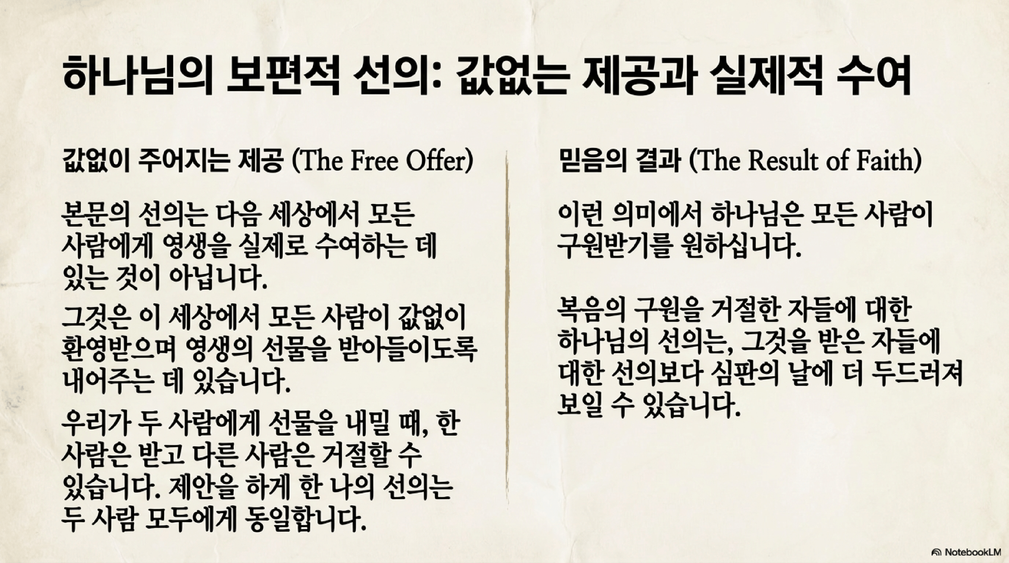 - 하나님의 보편적 선의: 하나님은 심판을 늦추심으로써 모든 사람이 회개에 이르기를 원하시는 보편적 선의와 오래 참으심을 드러내신다. 복음의 초대는 특권이며, 이를 거부하는 것은 하나님의 인자하심을 무시하는 것이다. (보스턴)
