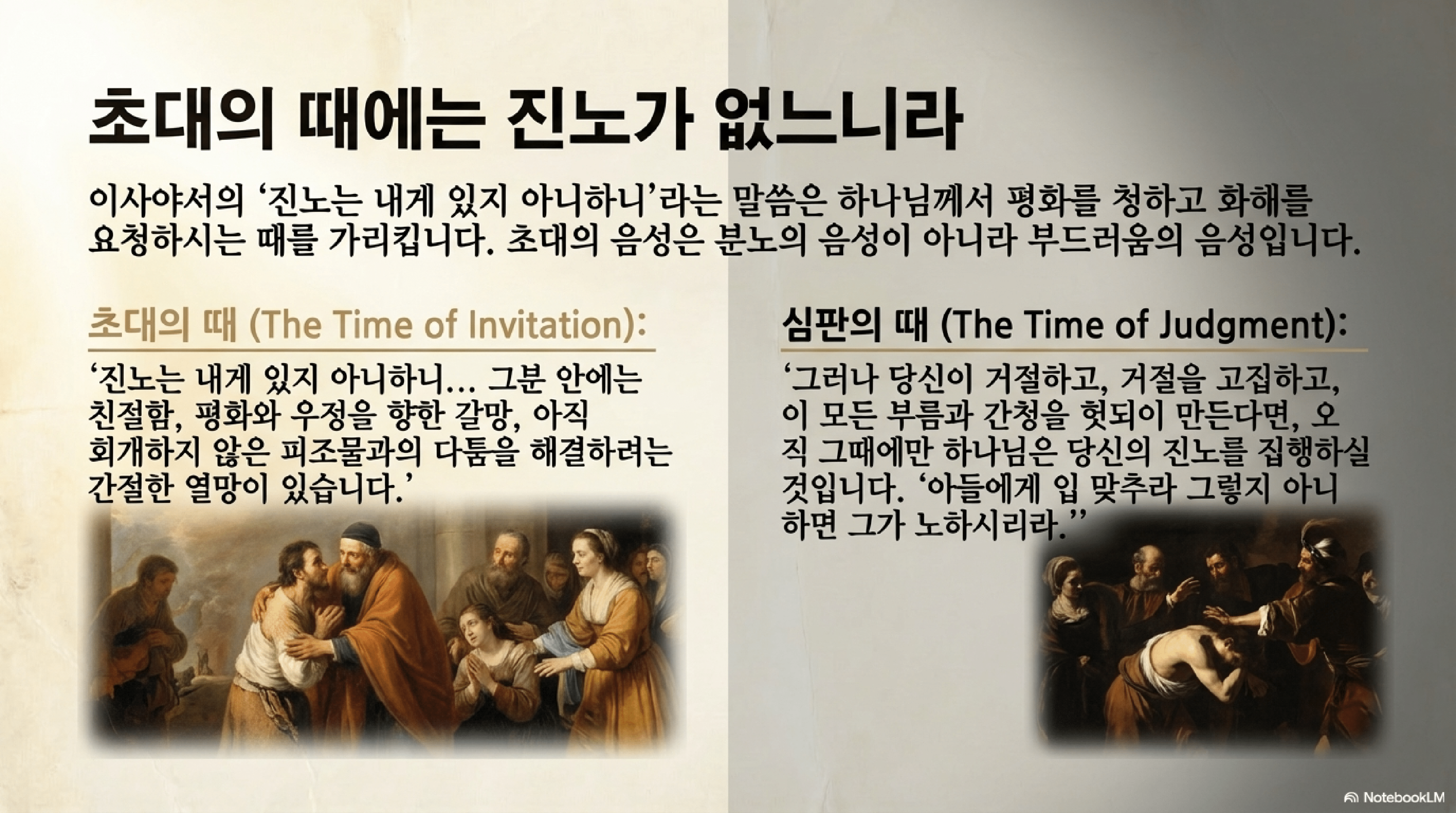 - 미래의 진노: 진노는 초대를 거부하고 불신과 경멸로 외면하는 자들을 위해 예비되어 있다. 자비의 계절이 끝나고 마지막 나팔 소리가 울리면, 죄인들이 쌓아온 진노가 그들 위에 쏟아질 것이다. 그러나 "오늘", 초대가 유효한 지금 이 순간에는 하나님께 진노가 없다.