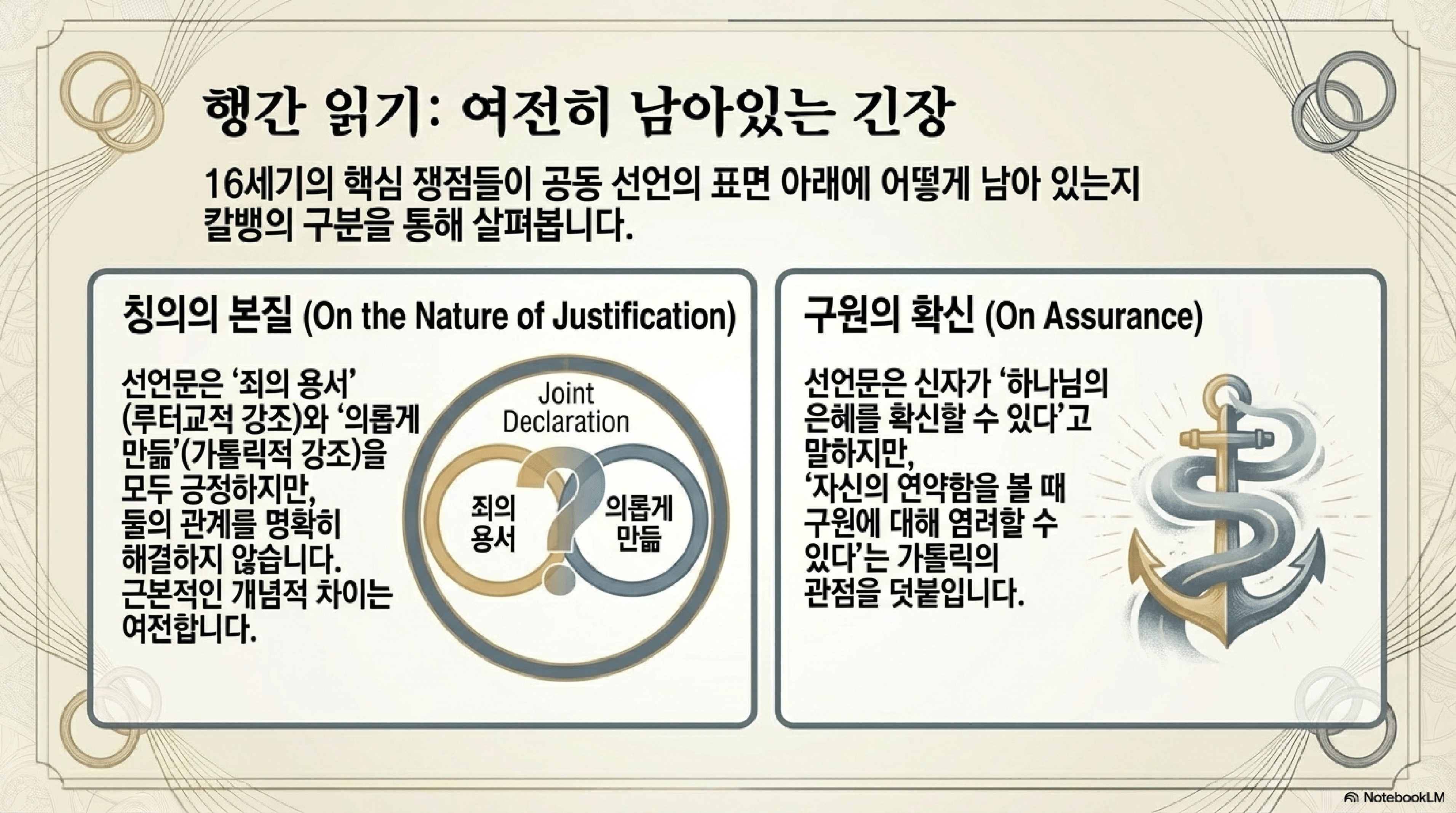- 구원의 확신의 가능성: 신자가 그리스도 안에서 드러난 하나님의 호의를 확신하며 평화를 누릴 수 있는가, 아니면 자신의 불완전함 때문에 늘 불안 속에 머물러야 하는가?