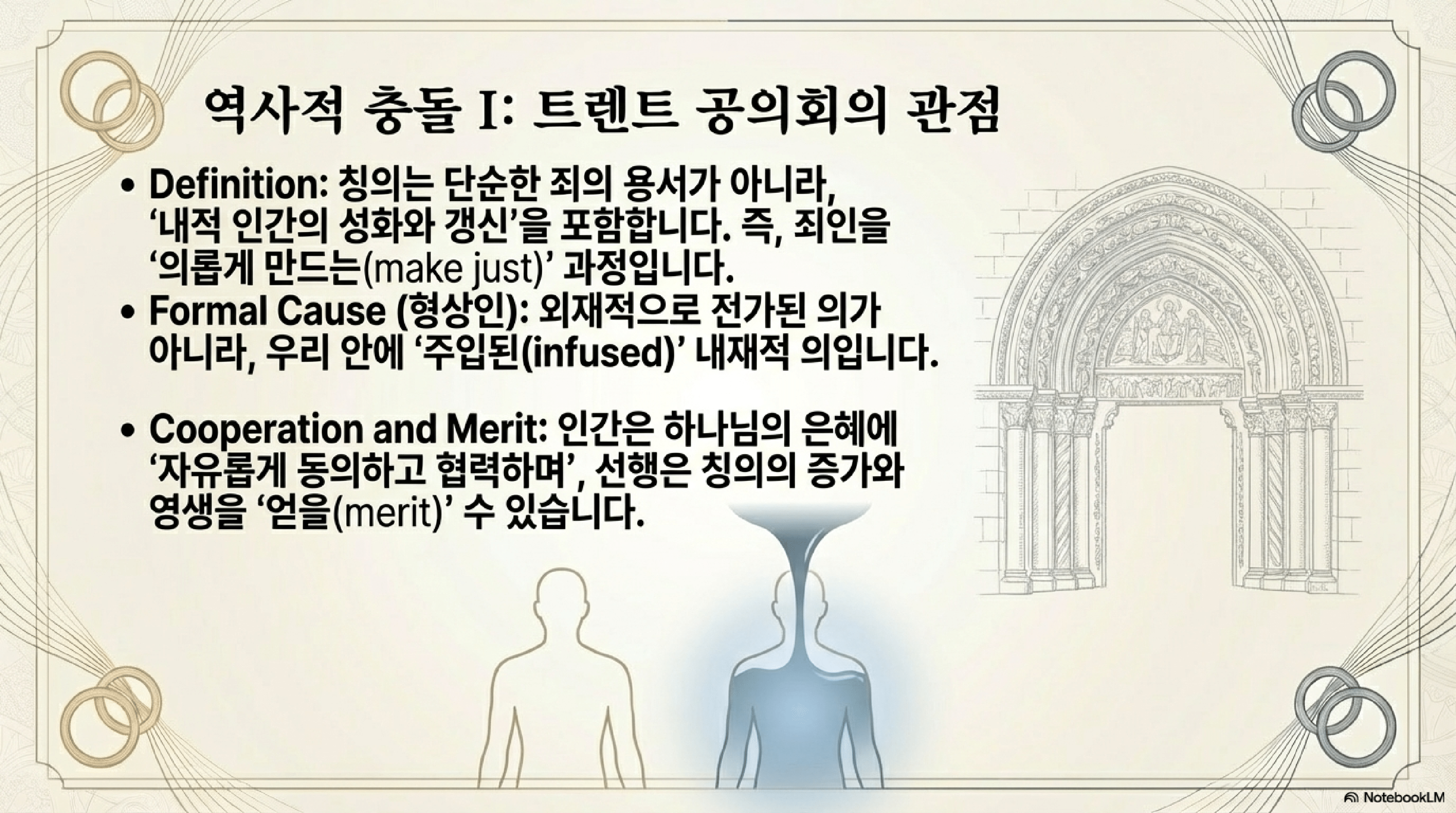 - 칼빈 신학의 기여: 칼빈의 '이중 은혜' 개념은 이 논쟁을 명확히 하는 데 결정적인 기여를 한다. 그는 성화의 필연성을 강조함으로써, 신자의 삶에 실제적인 변화가 일어나야 한다는 가톨릭의 우려에 충분히 답한다. 동시에 칭의를 성화와 명확히 구별함으로써, 구원은 인간의 공로나 상태가 아닌 오직 하나님의 무조건적인 은혜에 근거한다는 개신교의 핵심 원리를 확고히 지킨다. 이를 통해 논쟁의 초점을 '변화가 필요한가'라는 문제에서 '하나님 앞에서의 인정 근거는 무엇인가'라는 더 근본적인 질문으로 이동시킨다.