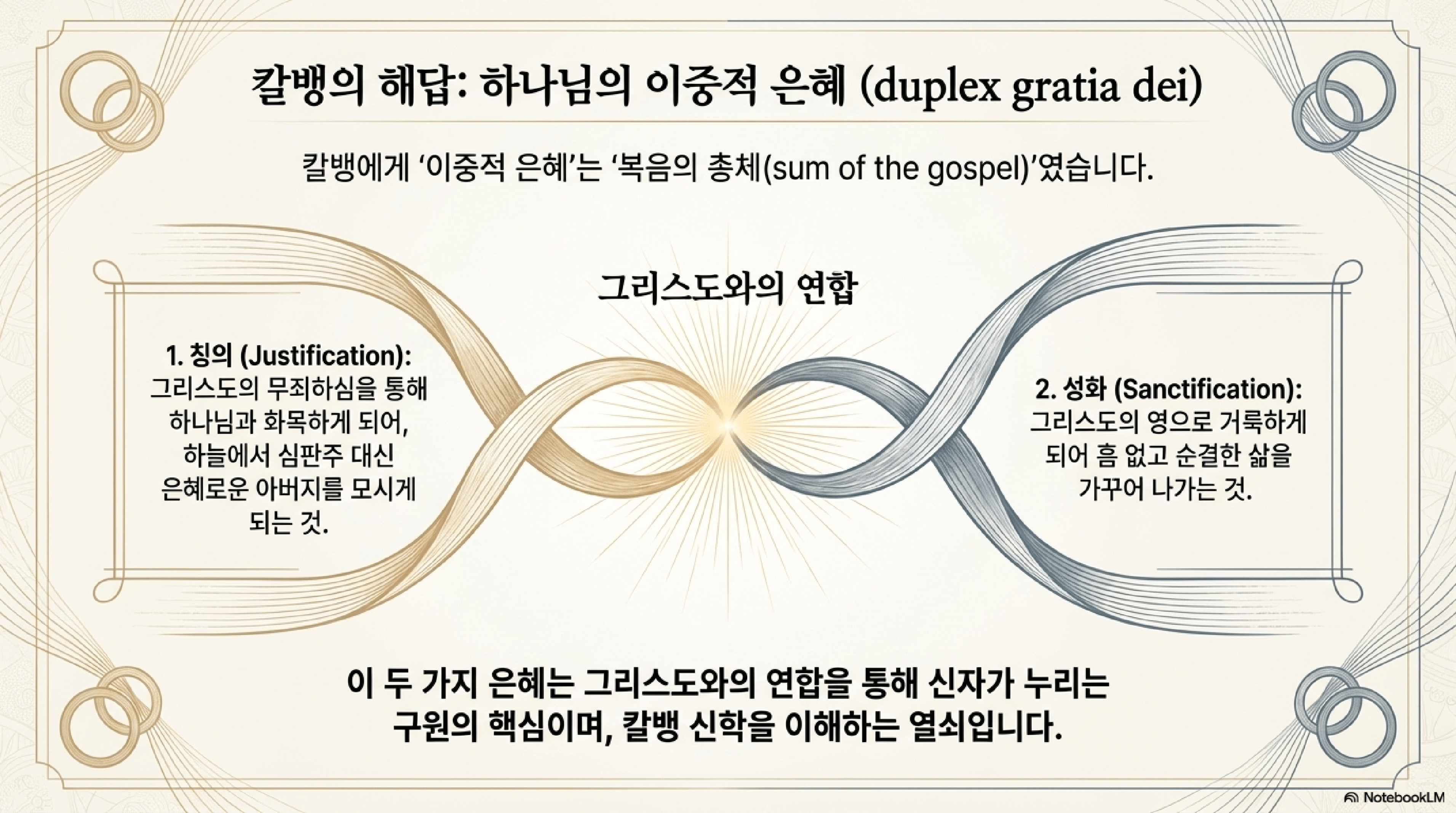칼빈은 『기독교 강요』 3권에서 그리스도를 통한 구원의 복음을 다루며, 신자가 믿음으로 그리스도와 연합할 때 누리는 두 가지 핵심적인 혜택을 '하나님의 이중 은혜(duplex gratia dei)'라고 칭한다. 이것이 바로 칭의와 성화이며, 칼빈은 이를 "복음의 총화(sum of the gospel)"라고 일관되게 주장한다.