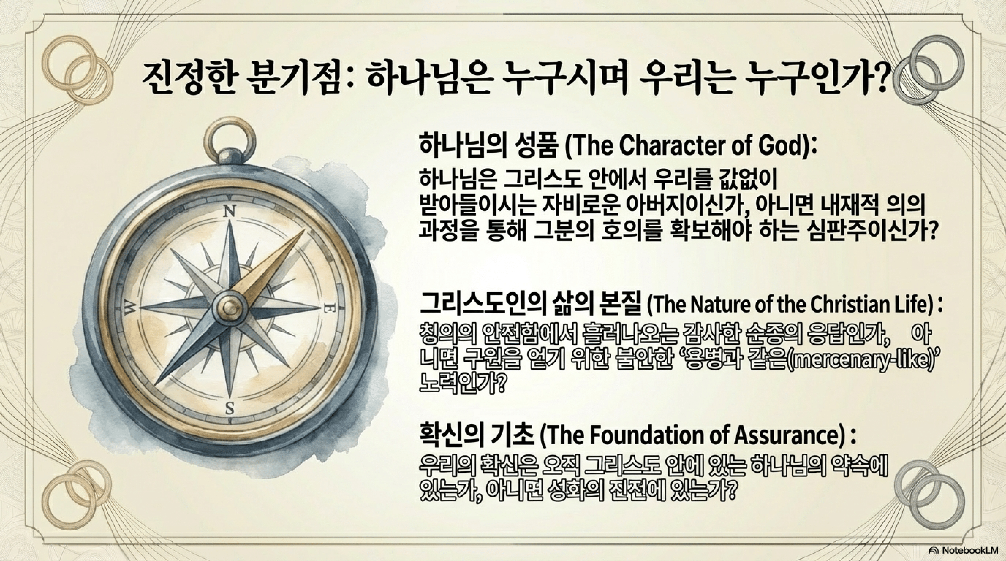 - 하나님과의 관계의 질: 하나님과 신자의 관계가 자신의 공로에 따라 보상을 기대하는 '계약적, 용병적 관계'인가, 아니면 오직 자비로운 아버지의 은혜에 감사하며 신뢰하는 '자녀의 관계'인가?