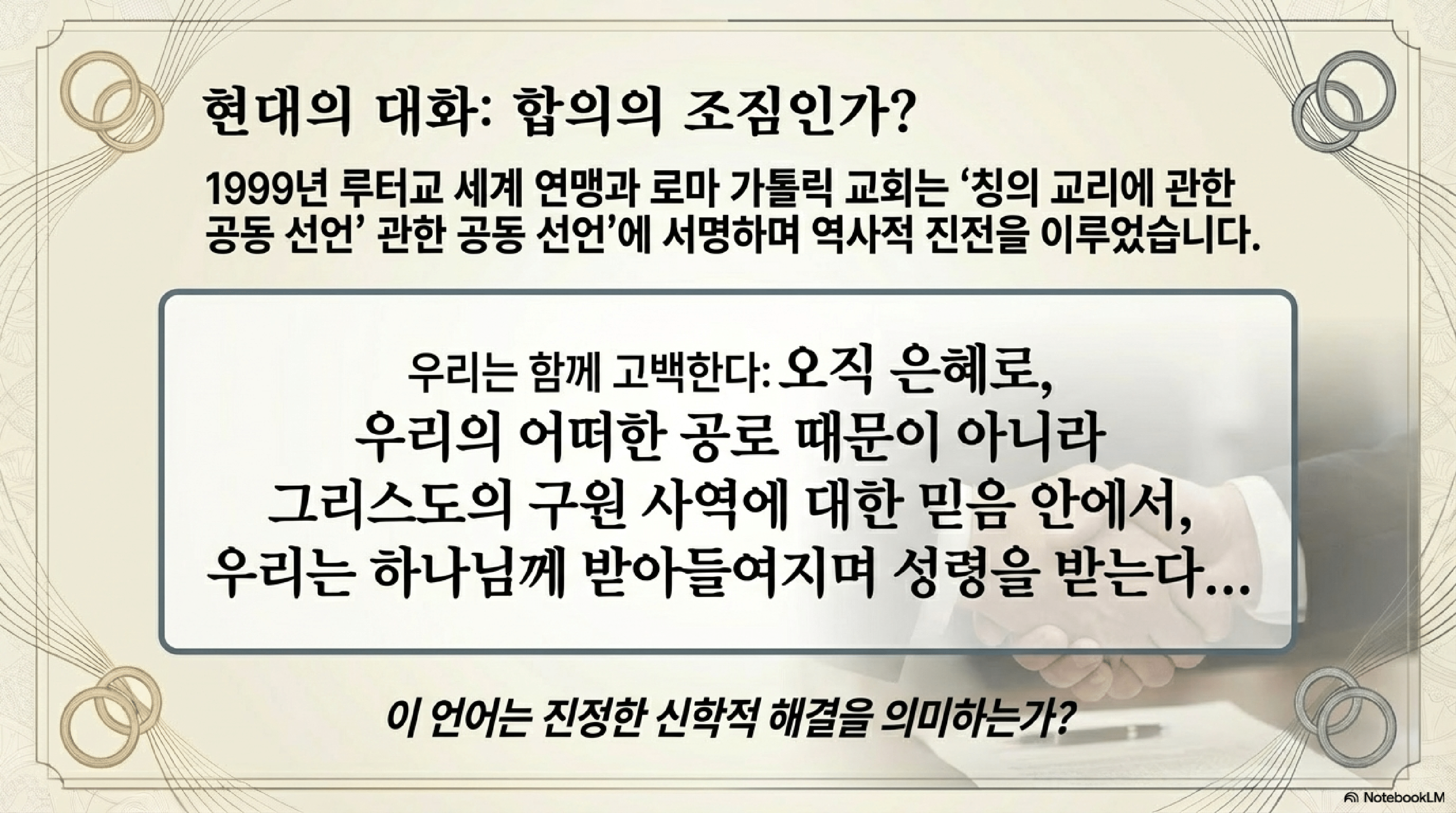 - 합의와 차이: 이 선언은 많은 부분에서 합의에 도달했음을 보여주었으나, 다음과 같은 핵심 쟁점에서 여전히 신학적 차이가 존재함을 인정했다.