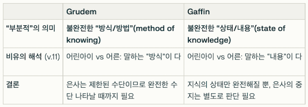 Grudem과 Gaffin의 진정한 차이는 τὸ ἐκ μέρους("부분적인 것")를 어떻게 해석하는가에 있다.