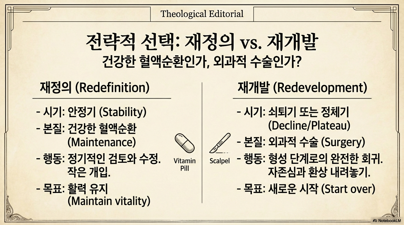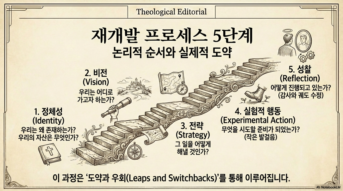 - 타이밍의 중요성: 성공적인 재개발을 위해서는 회중이 변화의 필요성을 인지하고 마음이 열려 있는 '기회의 창(Window)'이 열렸을 때 개입해야 한다. 새로운 목회자 부임이나 건물 보수 계획 등이 그 계기가 될 수 있다.