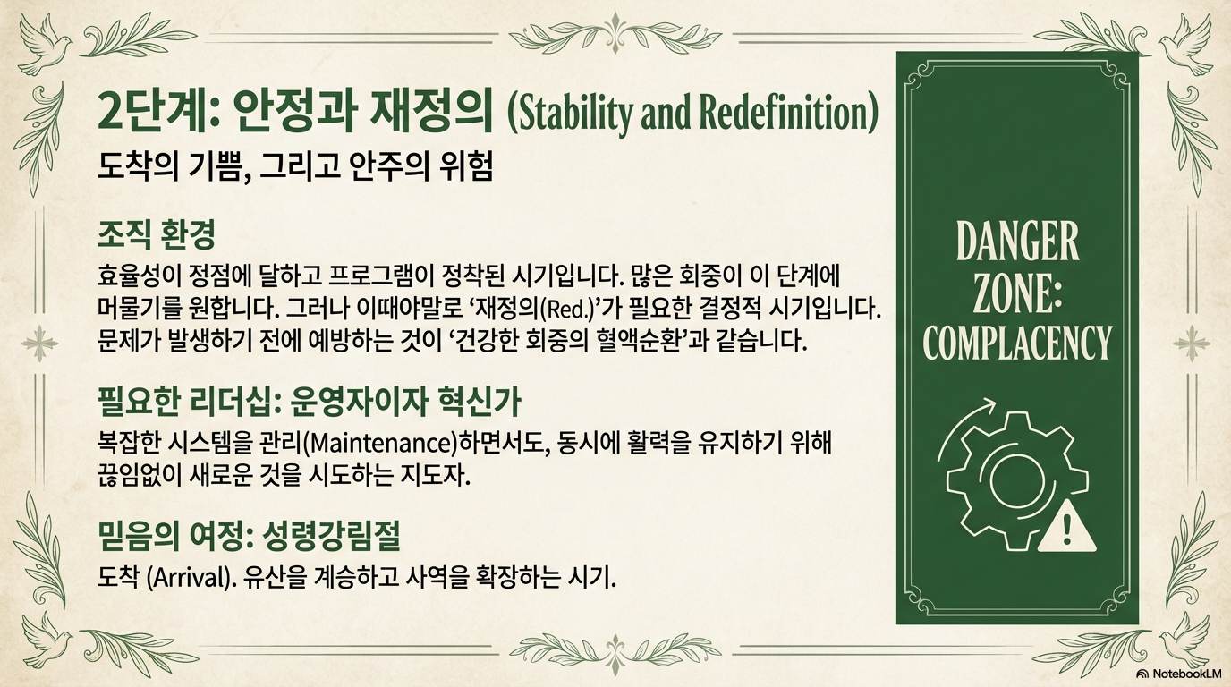 - 징후: 출석률, 예산, 또는 신앙의 여정이 10년(Plateau Decade) 동안 정체될 때 위험 신호로 간주한다.