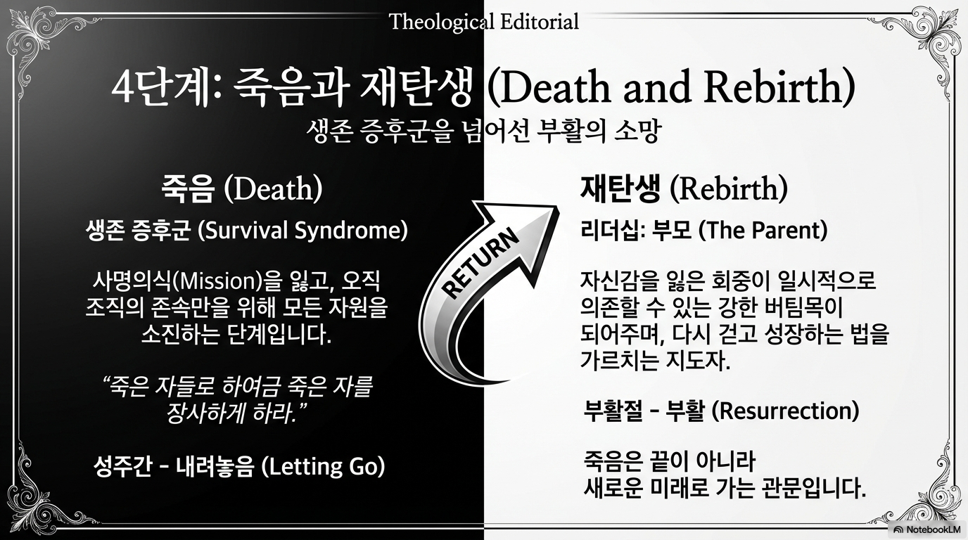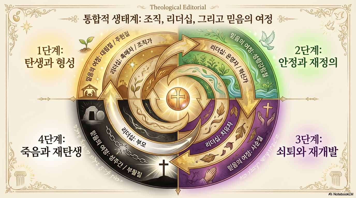 이 논문의 핵심적인 통찰은 회중이 쇠퇴의 징후가 나타나기 전인 '안정기'에 지속적인 '재정의'를 통해 활력을 유지해야 한다는 점이다. 또한, 각 단계마다 촉매자(Catalyst), 조직가(Organizer), 운영자(Operator), 치유자(Healer), 부모(Parent)와 같은 서로 다른 리더십 역량이 요구된다. 회중의 운명은 단순히 내부적 요인뿐만 아니라, 도시와 농촌의 인구 이동, 경제적 변화, 정착지의 생애 주기와 밀접하게 연동되어 있다. 본 보고서는 이러한 생애 주기를 성서적 신앙 여정과 결합하여, 죽음의 위기에서도 부활의 신앙을 통해 새로운 창조로 나아갈 수 있는 전략적 방향을 제시한다.