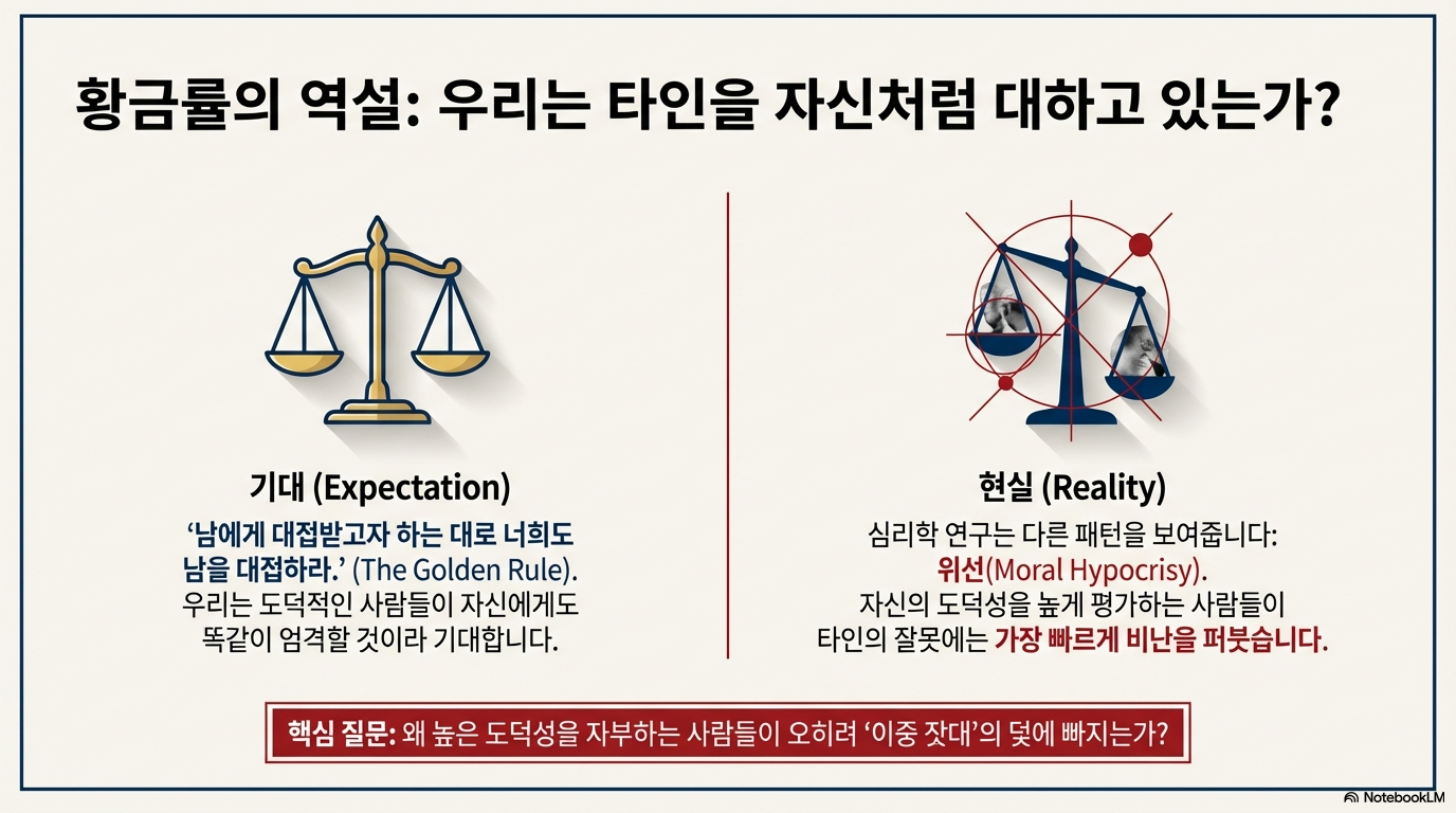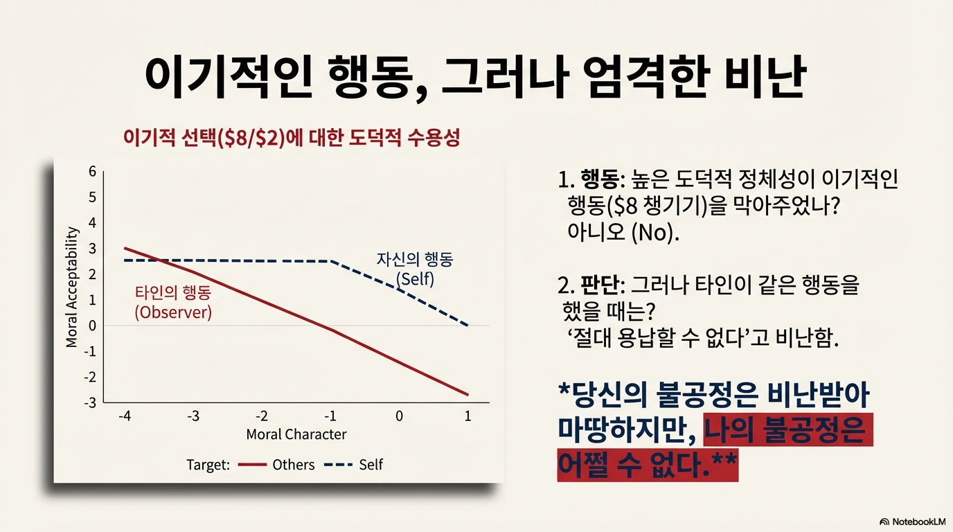이번 포스팅은 자기 보고된 도덕적 품성(Self-reported moral character)이 실제 도덕적 행동이나 판단과 항상 일치하지 않는 이유를 분석한다. 연구 결과에 따르면, 스스로를 도덕적이라고 평가하는 개인들은 특히 평판 관리 동기(Reputation management motives)가 강할 때 타인의 잘못에는 엄격한 잣대를 들이대면서도 자신의 위반 행위는 가볍게 여기는 '도덕적 위선' 또는 '도덕적 이중 잣대'를 보이는 경향이 있다.