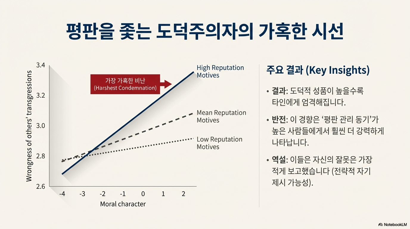 - 상호작용 효과: 평판 관리 동기가 높은 집단에서 도덕적 품성 점수가 높을수록 타인에 대한 비난은 증가했으나, 자신에 대한 비난은 오히려 감소하거나 변화가 없었다.