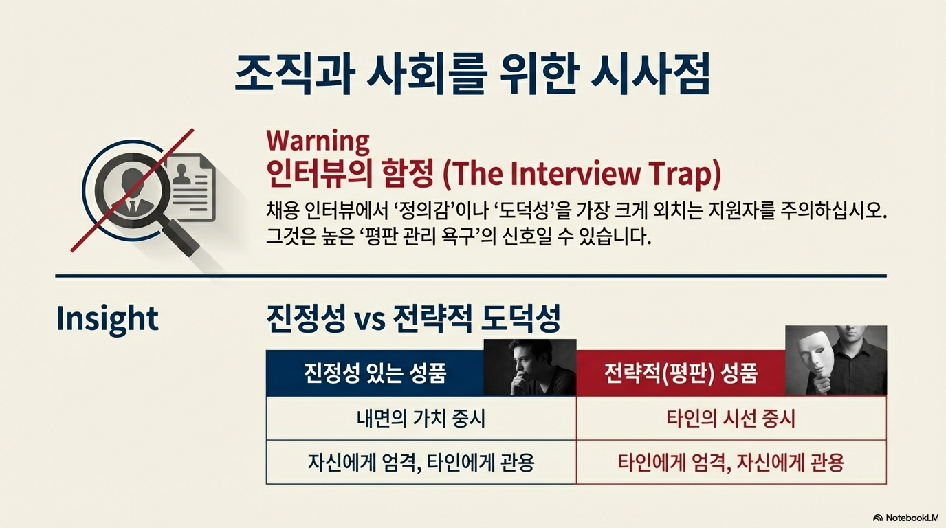 - 도덕적 품성의 두 얼굴: 자기 보고된 도덕적 품성에는 '진정한' 도덕적 갈망뿐만 아니라 타인에게 좋게 보이고자 하는 '평판 관리' 성격이 공존한다.