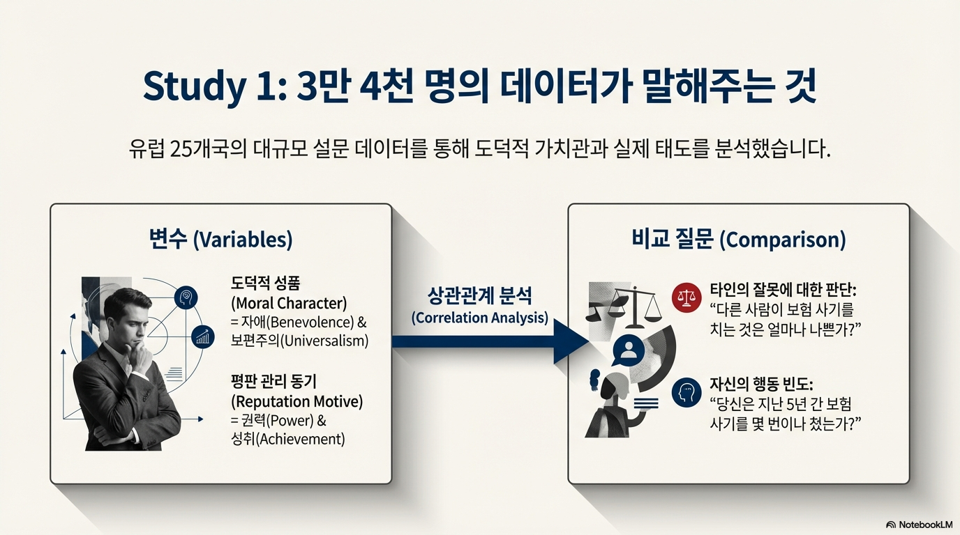 구분 도덕적 품성 (Moral Character) 지표 평판 관리 동기 (Reputation Management) 지표 연구 1 자애(Benevolence) 및 보편주의(Universalism) 가치 권력(Power) 및 성취(Achievement) 가치 연구 2 정의 민감도 (Justice Sensitivity) 자기 모니터링 (Self-monitoring) 연구 3 도덕적 정체성 (Moral Identity) 지위에 대한 관심 (Concern about status)