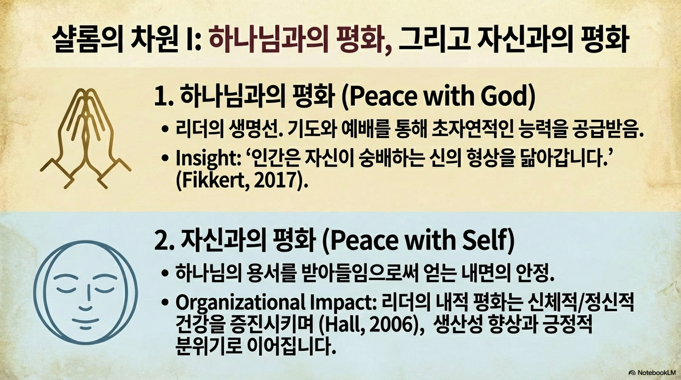 - 하나님과의 평화: 하나님은 리더의 삶의 중심이어야 한다. 기도, 예배, 성경 공부를 통한 영적 교제는 리더에게 샬롬을 가져오는 초자연적인 힘을 제공하며, 이는 조직 내에서 종복 리더십(Servant Leadership)으로 나타난다.