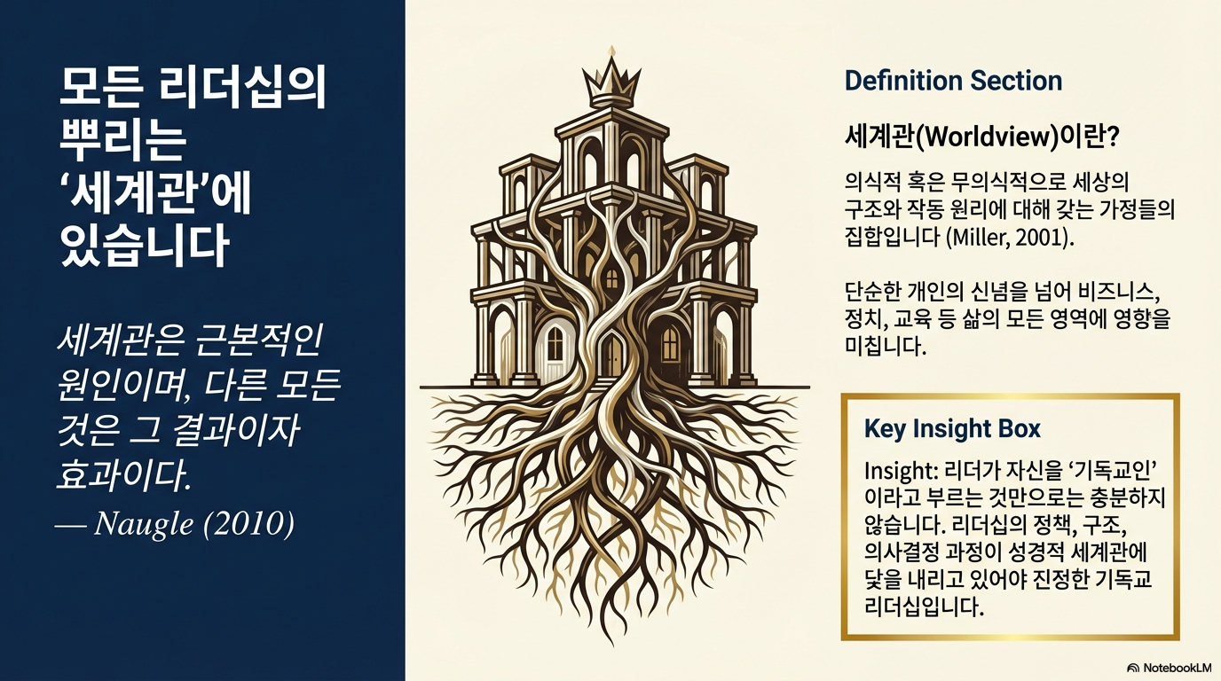 세계관은 인간이 세상을 바라보고 상호작용하는 근본적인 가정을 의미한다. 이는 리더의 행동, 태도, 의사결정 과정을 보이지 않게 지배하는 핵심 요소이다.