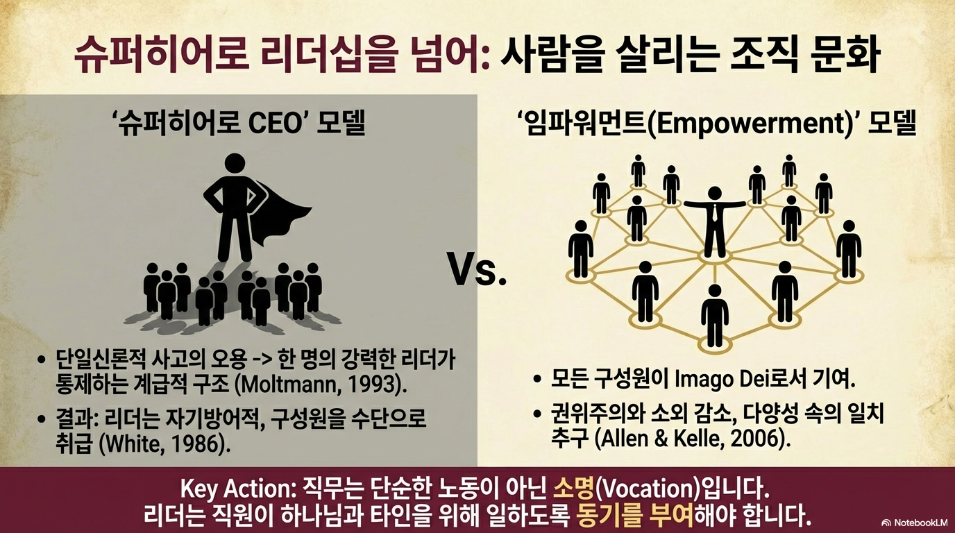 기독교 리더십은 한 명의 리더가 모든 권한을 갖는 '슈퍼히어로'나 'CEO형' 모델에서 벗어나, 상호 의존적이고 협력적인 임파워먼트(Empowerment) 리더십으로 나아가야 한다. 이는 권위주의를 줄이고 모든 구성원이 잠재력을 발휘하도록 돕는다.