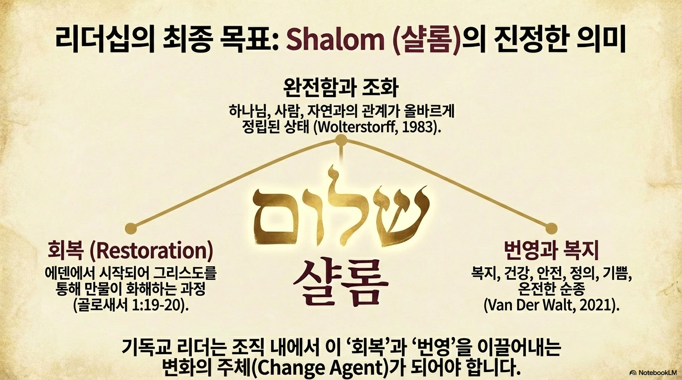 기독교 리더십의 본질은 하나님이 원래 의도하신 세상을 회복하는 '변화의 대리인'이 되는 것이다. Imago Dei와 Shalom의 패러다임은 인간의 가치를 회복하고, 조직 내에서 전인적인 번영을 이끌어내는 강력한 원리를 제공한다.