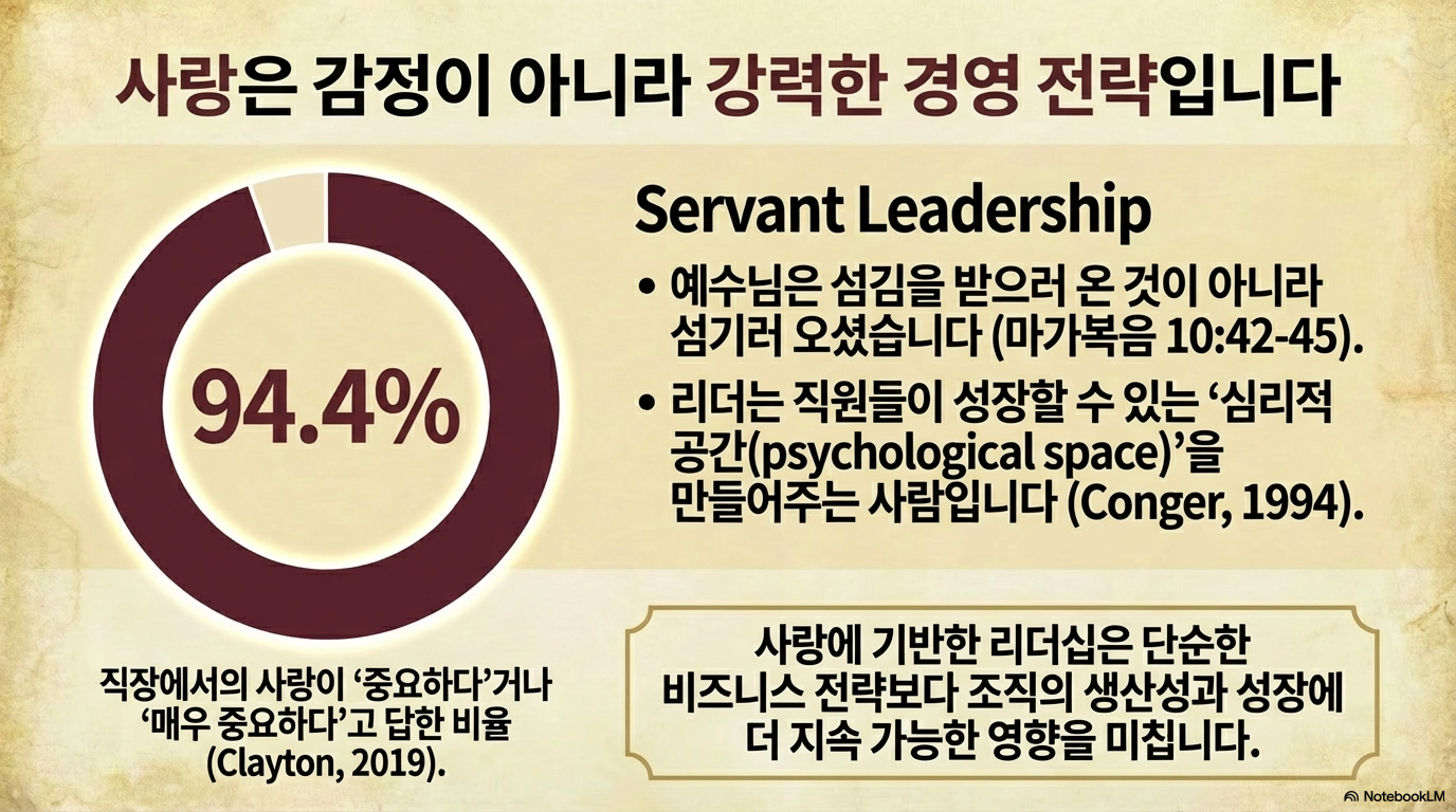 - Imago Dei의 적용: 인간을 하나님의 형상으로 인식함으로써 직원을 단순한 자원이 아닌 존엄한 존재로 대우하고, 그들의 은사와 관계성을 극대화하는 리더십 모델을 구축해야 한다.