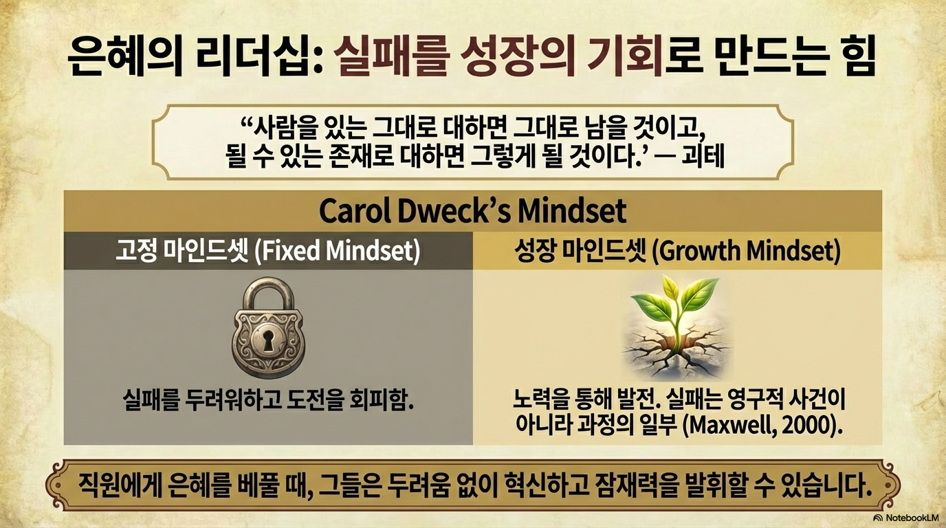 - 성장 마인드셋 (Growth Mindset): 리더는 직원이 실패하더라도 은혜를 베풀어야 한다. 이는 구성원이 실패를 성장의 과정으로 인식하고Boundless potential을 발휘하게 한다(Dweck, 2017).