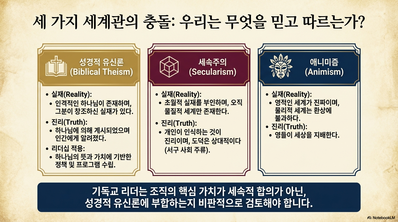 유형 특징 성경적 유신론 (Biblical Theism) 인격적인 하나님이 물리적·영적 세계를 창조했음을 믿으며, 하나님에 의해 계시된 진리와 가치를 따른다. 세속주의 (Secularism) 초월적 실재를 부정하고 물리적 세계만을 인정하며, 진리와 도덕을 상대적인 것으로 간주한다. 애니미즘 (Animism) 실재를 영적인 것으로 보며, 보이지 않는 영들이 세상을 통제하고 물리적 세계는 환상이라고 믿는다. 기독교 리더는 자신의 세계관과 조직의 운영 원칙이 성경적 유신론에 부합하는지 비판적으로 검토해야 한다. 리더십이 '기독교적'이라고 불리기 위해서는 정책, 조직 구조, 프로그램 구현 등 모든 영역이 성경적 신앙에 기반해야 한다.