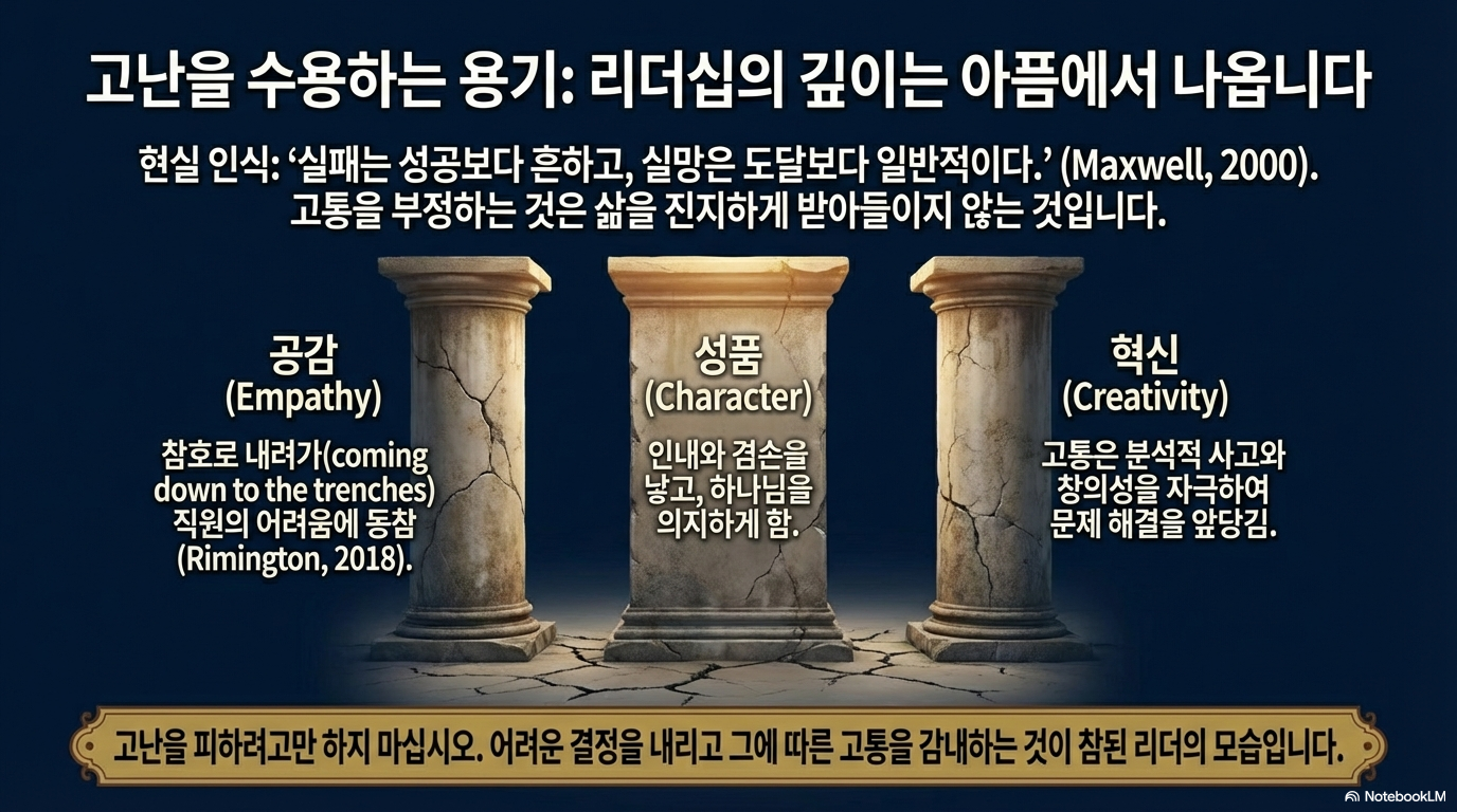- 고난과 가치의 정렬: 성공적인 리더십은 고난을 성장의 기회로 수용하며, 조직의 공표된 가치와 실제 실행되는 가치를 일치시키는 정직함을 전제로 한다.