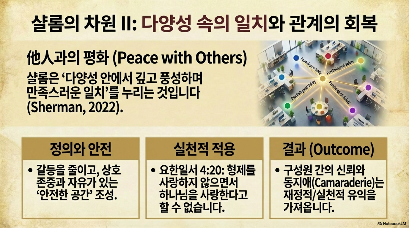 - 타인과의 평화: 샬롬은 다양성 속의 일치를 경험하는 것이다. 사랑, 공의, 안전이 보존되는 일터는 갈등을 줄이고 정의로운 환경을 조성한다.