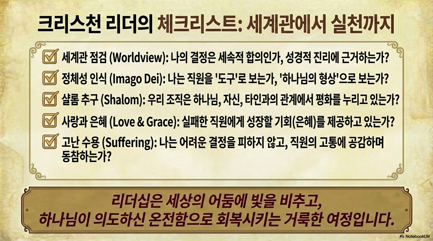 진정한 기독교 리더는 자신의 위치를 권리가 아닌 타인에 대한 책임과 의무로 인식하며, 사랑에 동기를 부여받아 샬롬을 추구해야 한다. 이를 통해 하나님과 사람, 사람과 환경 사이의 관계를 화해시키고, 조직의 수익성뿐만 아니라 공동체 전체의 안녕과 풍요를 달성하는 것이 기독교 리더십의 궁극적인 목표이다.