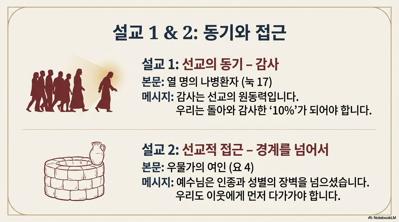 - 선교의 동기 - 감사 (누가복음 17:11-19): 열 명의 나병환자 치유 사건을 통해, 선교적 행동의 동기가 하나님께 받은 은혜에 대한 깊은 감사에서 우러나와야 함을 강조한다.