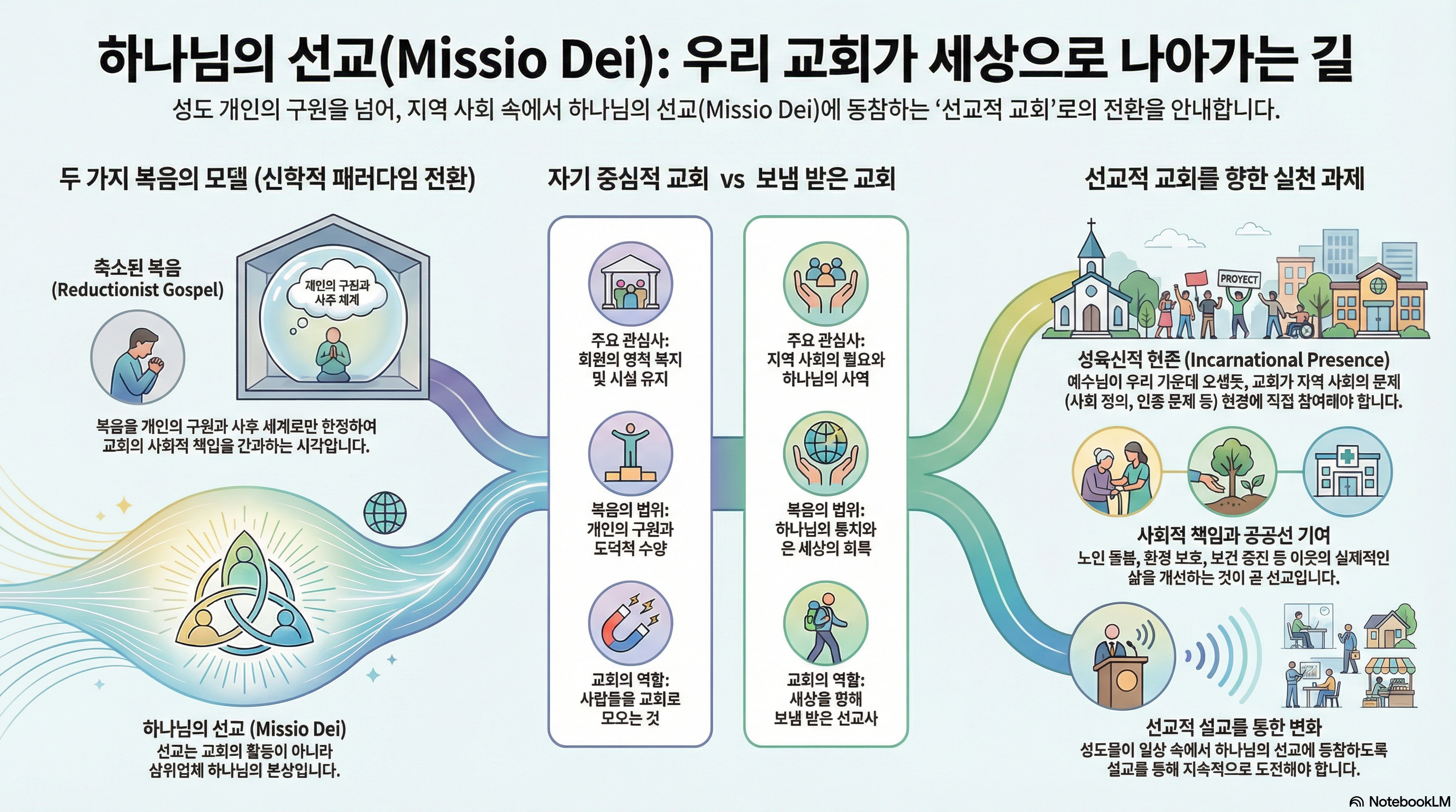 가장 핵심적인 통찰은 교회의 선교가 단순한 프로그램이나 지리적 확장이 아니라, 삼위일체 하나님의 본질적 속성이며 교회는 그 활동에 참여하도록 부름받은 '보냄 받은 공동체'라는 점이다. 기존의 '축소주의적 복음(Reductionist Gospel)'이 개인의 영혼 구원과 내세에만 집중했다면, 선교적 전환은 역사적 예수의 삶을 본받아 지역 사회의 고통에 동참하고 성육신적 사랑을 실천하는 것을 목표로 한다. 이를 위해 본 보고서는 7회의 설교 시리즈를 통한 인식 변화와 구체적인 지역 사회 봉사 모델을 제안한다.