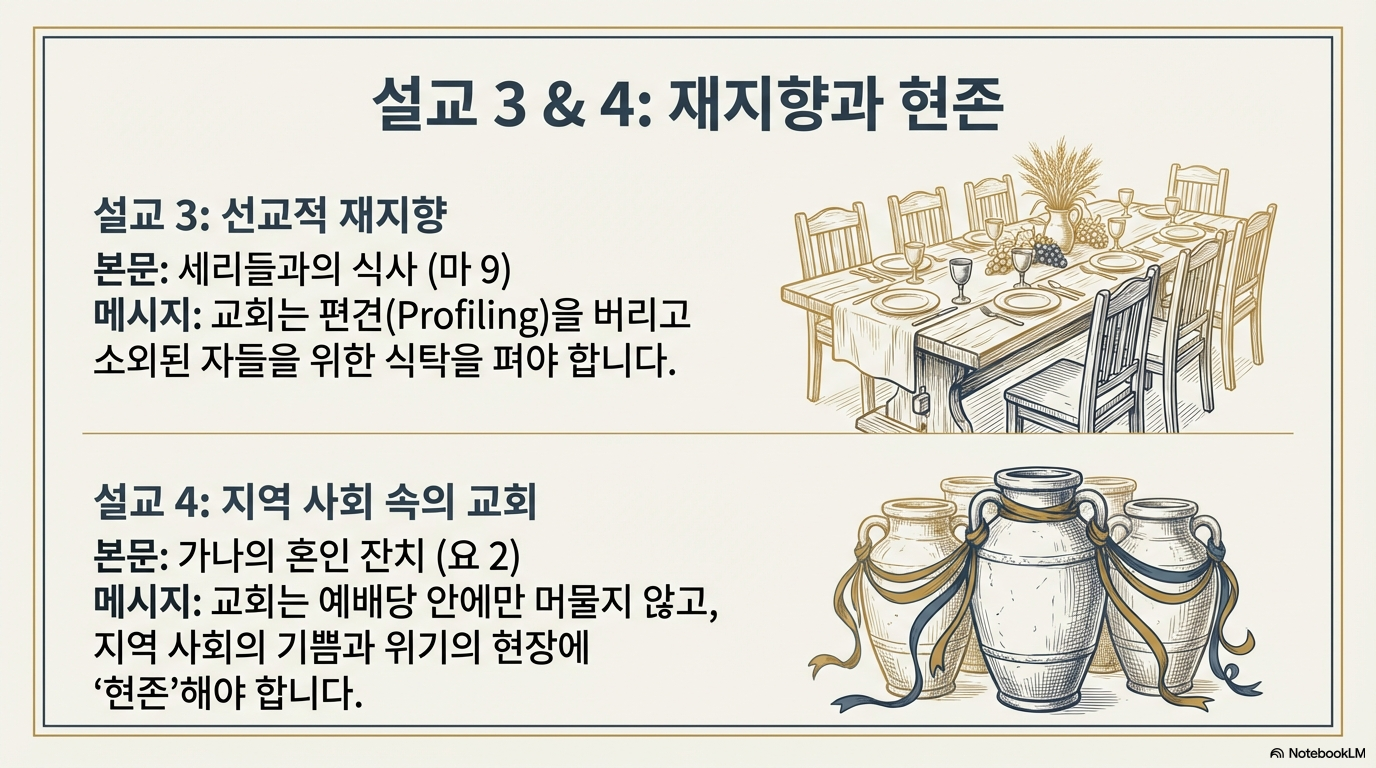 - 지역 사회 속의 교회 (요한복음 2:1-11): 가나 혼인 잔치에 참여하신 예수님처럼, 교회가 세속 사회의 행사와 일상 속에 '현존'해야 함을 강조한다.