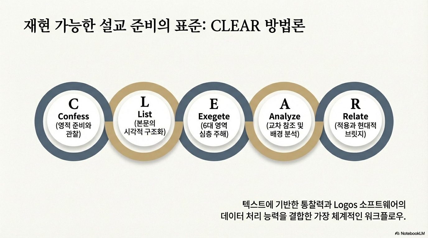 CLEAR 방법론은 설교 준비의 전 과정을 '기도에서 선포로(From Prayer to Proclamation)' 이어지는 논리적이고 영적인 흐름으로 정리한다. 설교자는 성경의 권위와 성령의 사역에 절대적으로 의존하되, 현대의 디지털 기술을 숙달함으로써 더 정교하고 강력한 하나님의 말씀을 전달할 수 있다.